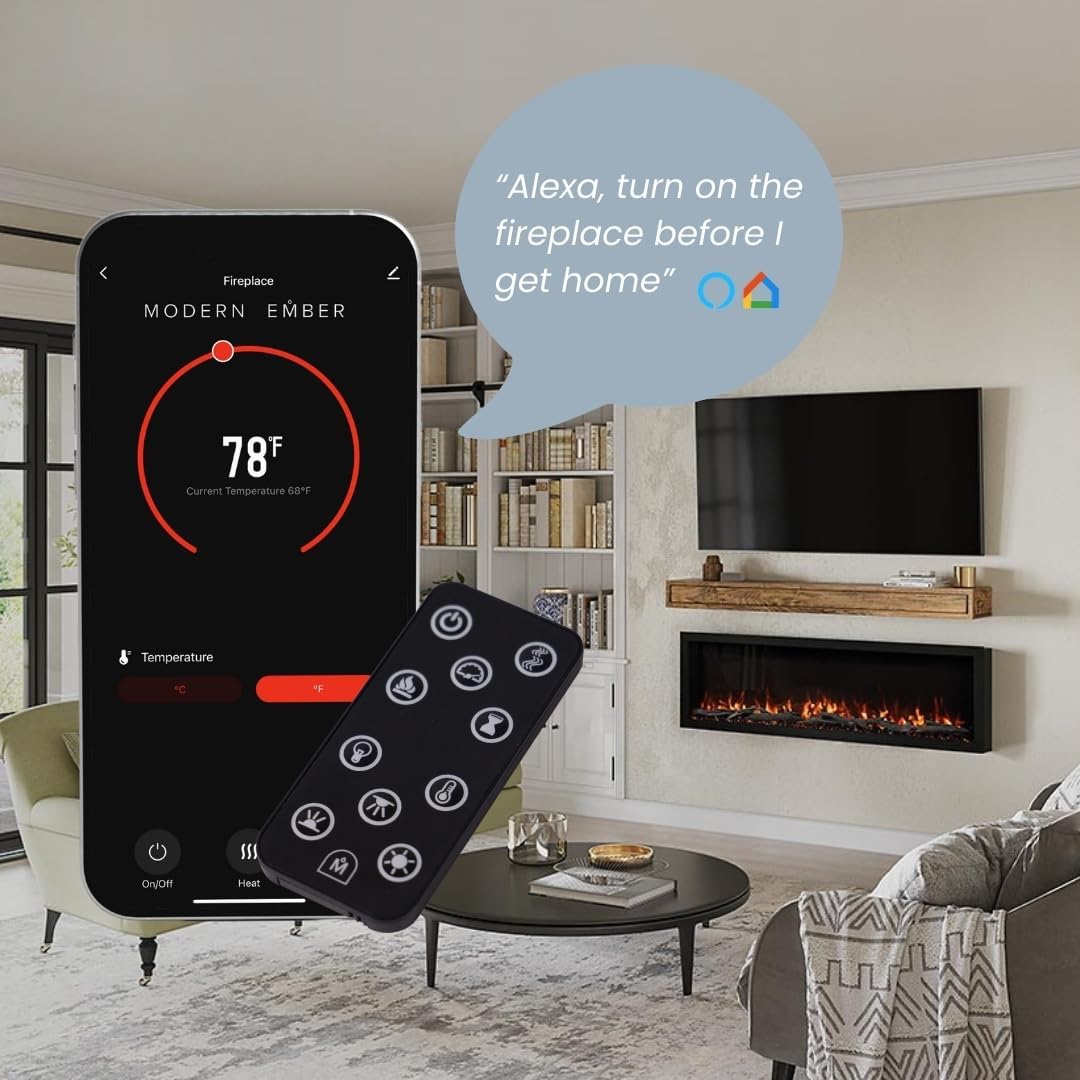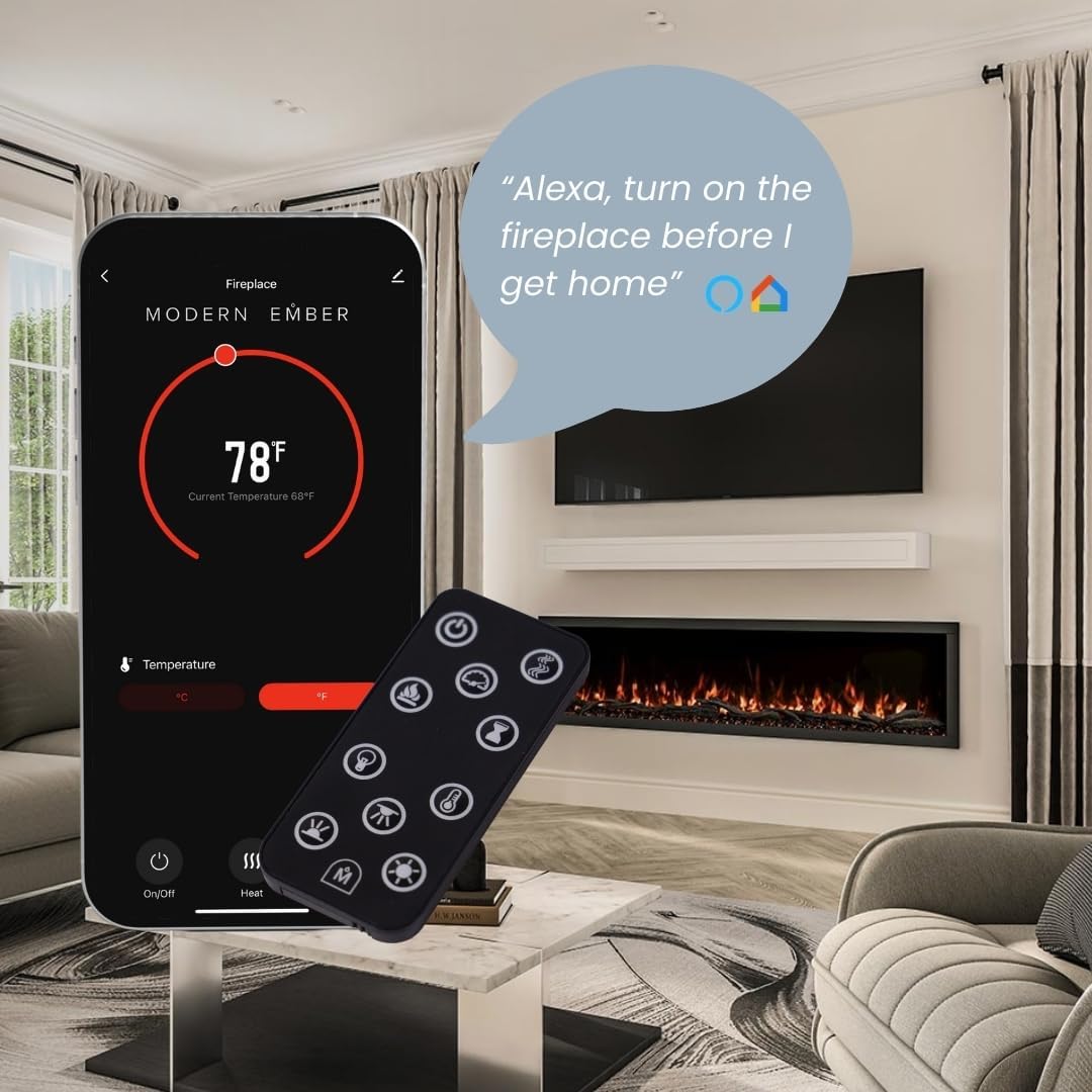 Elevate your living space with the Modern Ember Highmark 60-Inch Smart Linear Electric Fireplace, a perfect blend of modern design and advanced technology. Designed for recessed in-wall or wall-mounted installation, this premium electric fireplace offers a sleek hidden vent design and ultra-realistic flame display with 10 customizable flame colors to suit any ambiance.